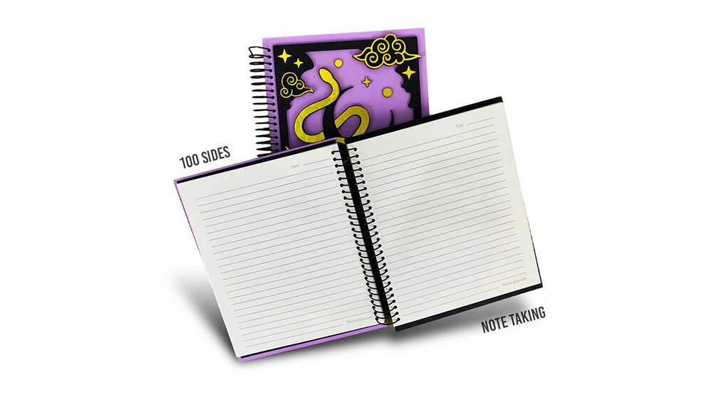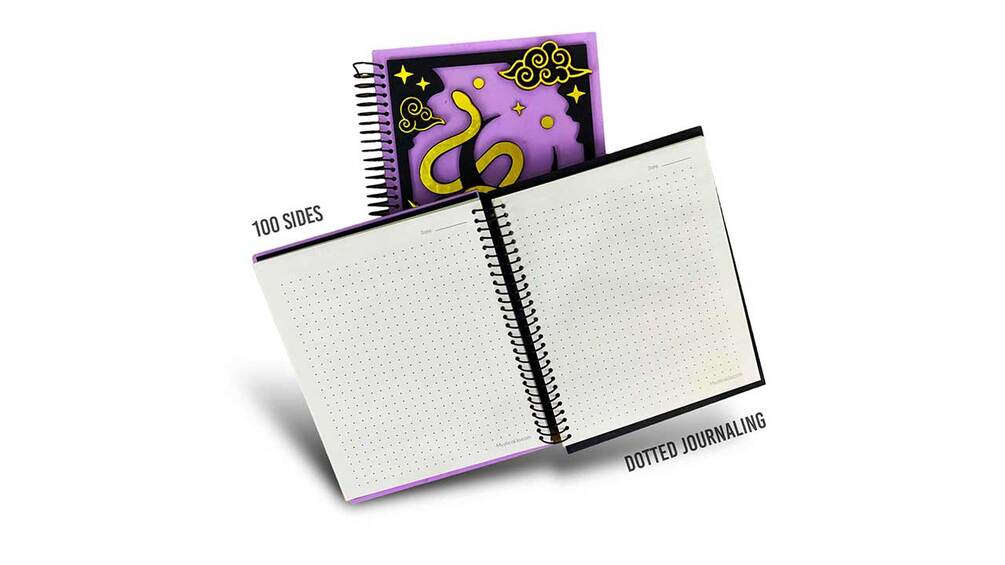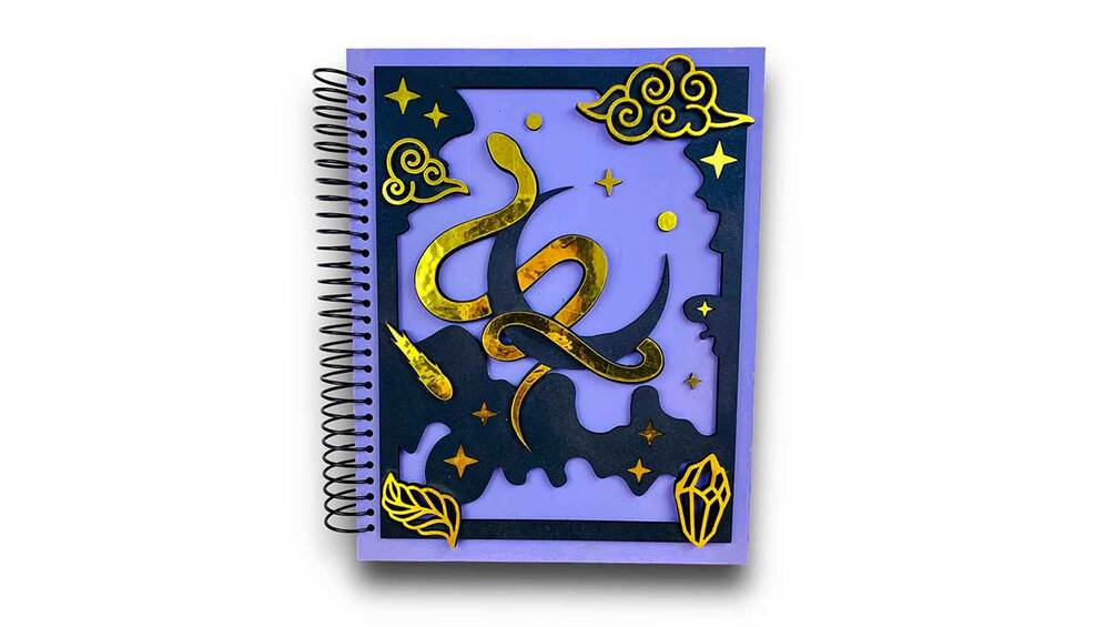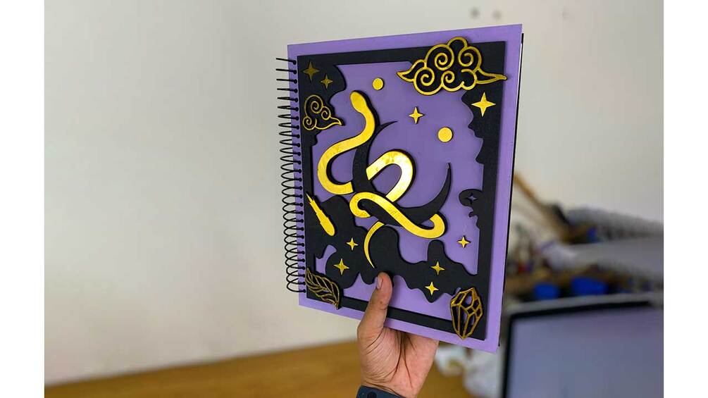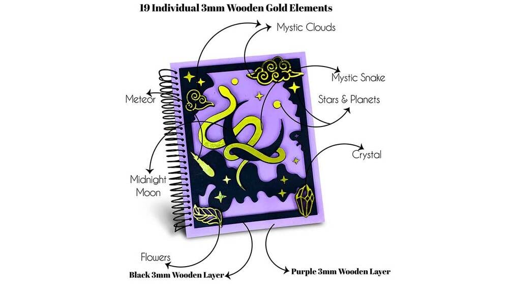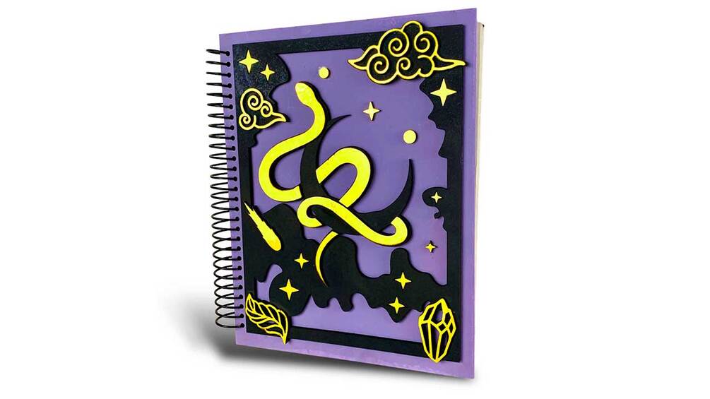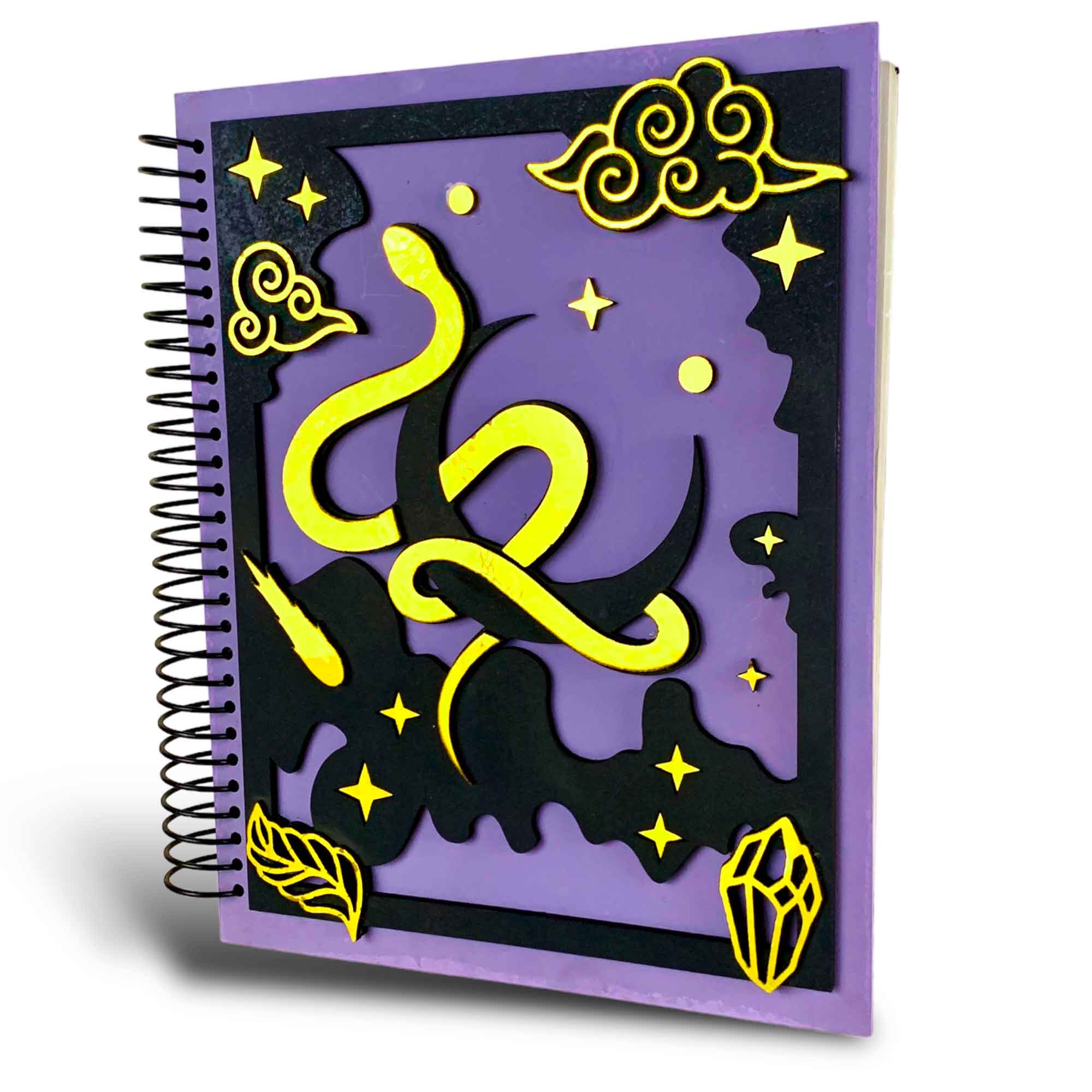 Introducing our enchanting Mystical Moon and Snake Notebook & Bullet Journal π, designed to add a touch of magic and elegance to your writing experience. This captivating notebook features a three-layer wooden cover in a regal purple shade with intricate black cutouts, exuding sophistication and tranquility. With 200 sides (100 sheets) of high-quality 100 gsm paper, it ensures a luxurious writing experience. Adorned with 19 meticulously crafted 3mm wooden gold cut-out elements, including mystical clouds, meteors, glistening crystals, delicate flowers, twinkling stars, and a colossal snake guarding the midnight moon, this notebook is a true work of art. πβ¨